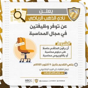 يسر نادي الذهب الرياضي الإعلان عن توفر فرصتين وظيفيتين شاغرتين في قسم المحاسبة، ويدعو أصحاب الكفاءات والخبرة أو حديثي التخرج في مجال المحاسبة إلى التقديم والانضمام إلى فريق عمل احترافي في بيئة رياضية متميزة.